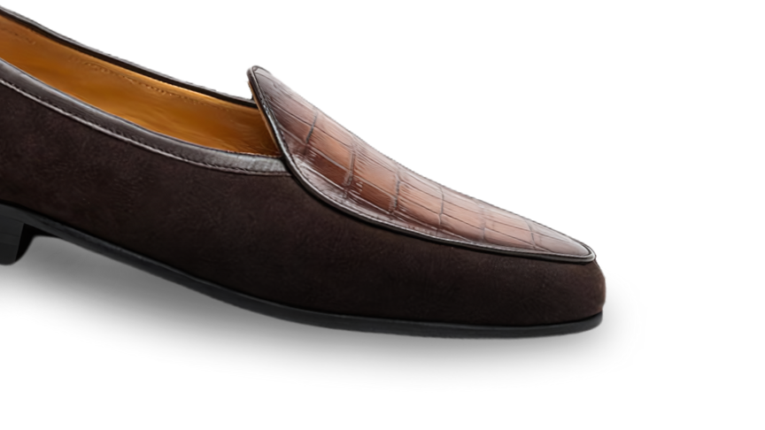 The Suede Croco Apron - Brown showcases the elegance of the apron style with a sophisticated croco pattern. This loafer is designed for the modern gentleman who values both tradition and contemporary design. It’s the ideal choice for those who seek to make a subtle yet powerful style statement.